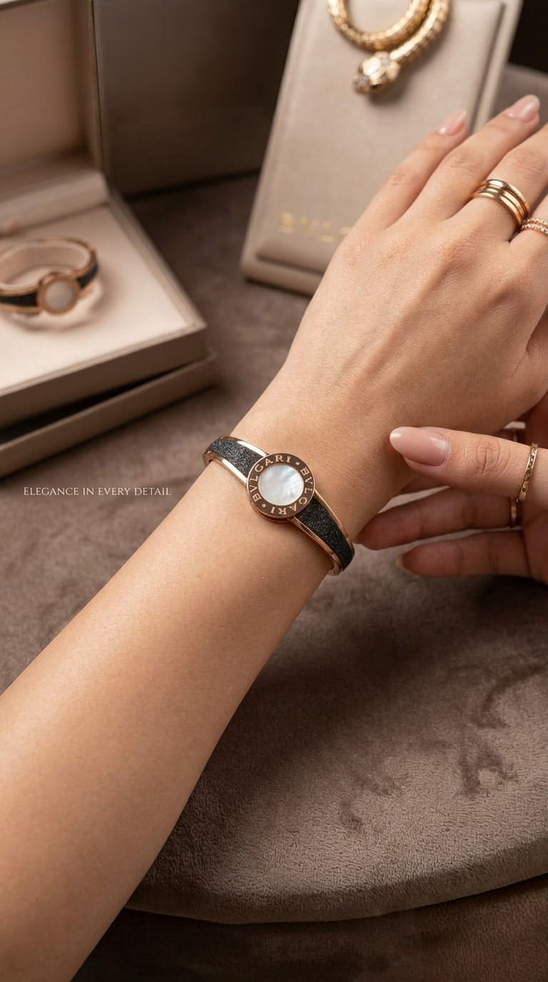 • Design : Features a round centerpiece with a white inlay, encircled by a rose gold-toned ring engraved with “BVLGARI” on both sides.