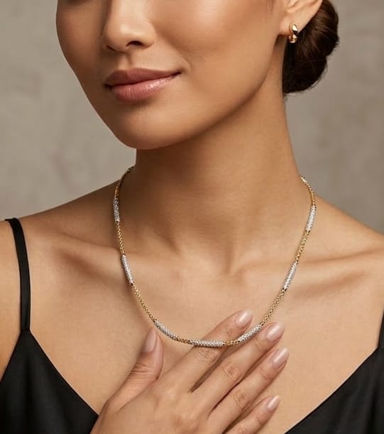 This elegant piece is a dual-toned artificial neck chain designed with a modern, textured aesthetic. It combines a sophisticated “ice” look with classic gold accents, making it a versatile accessory for both contemporary and traditional outfits.