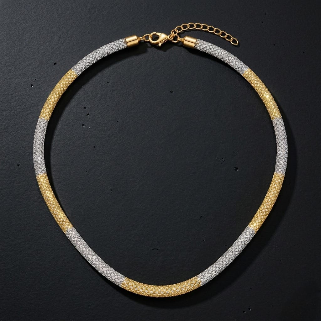 • Color Palette: Alternating segments of shimmering silver (rhodium-tone) and warm gold-tone plating.