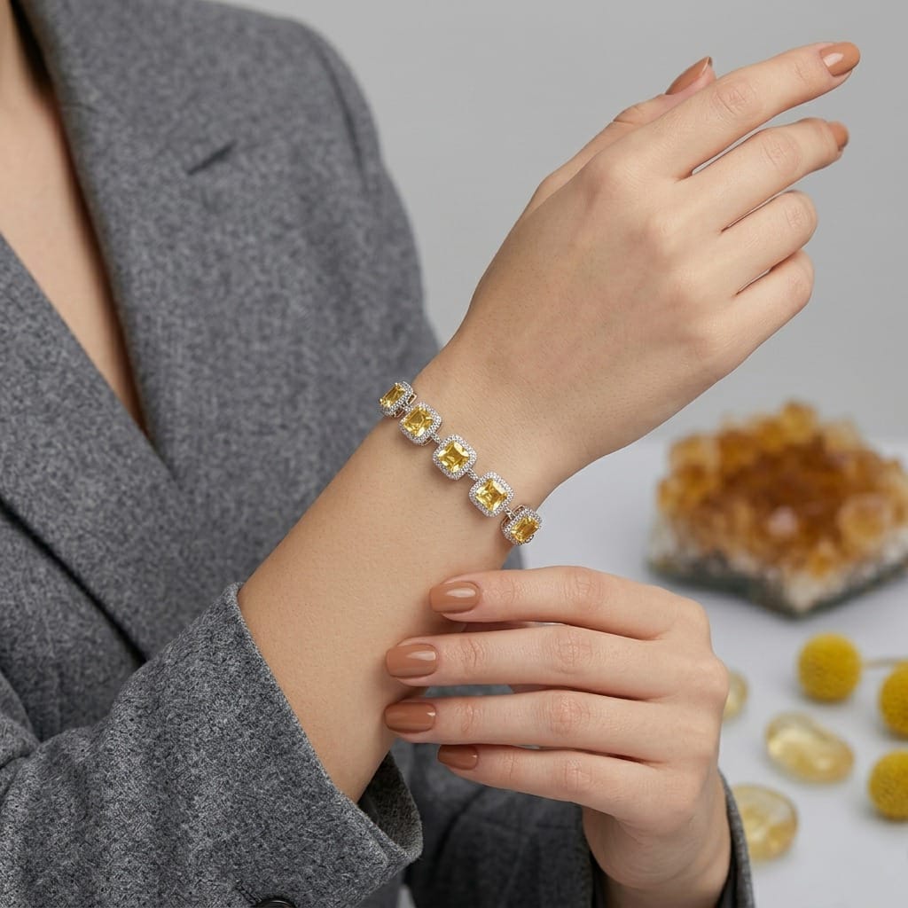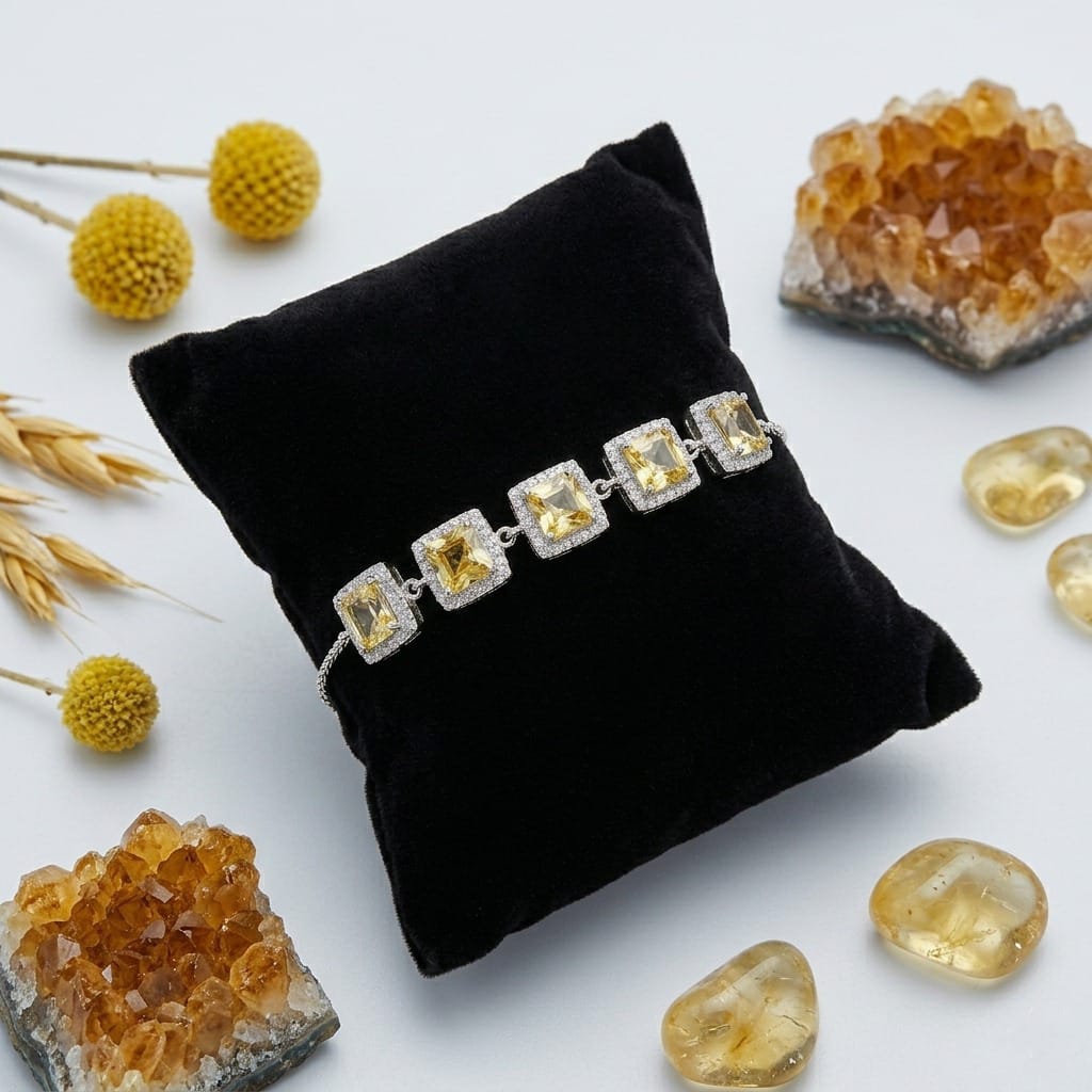 • The “Diamond” Border: Each yellow stone is surrounded by a frame of tiny sparkling crystals. It gives the bracelet a “halo” effect, making the main stones look even bigger and shinier.