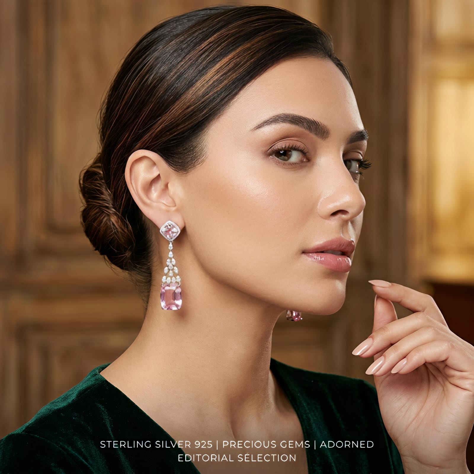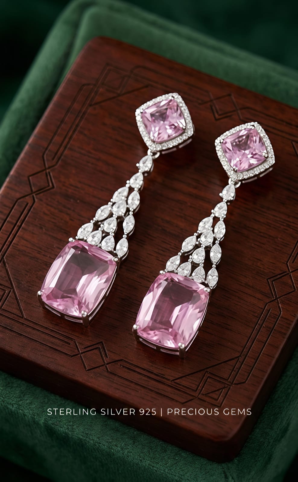 Exquisite Gemstones: The centerpieces are stunning, cushion-cut pink premium crystals that offer a soft, romantic glow.