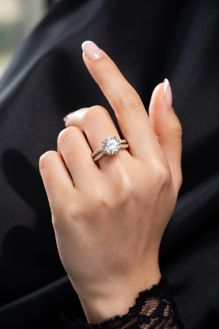 • The Unique Band: Instead of a plain gold band, this features a “Split-Shank” design—the gold band separates as it reaches the center stone, creating a graceful, airy look on your finger.