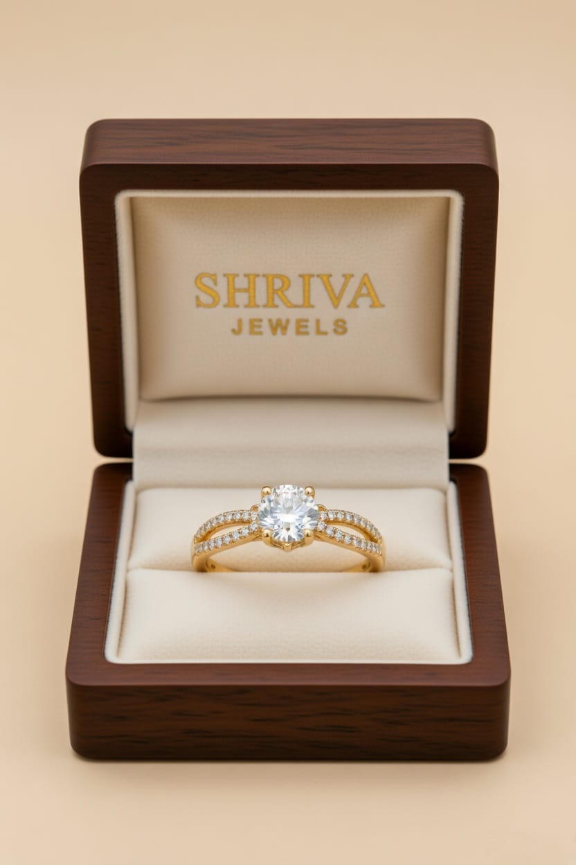 This American Diamond (AD) solitaire ring features a sophisticated split-shank design, meticulously crafted to mirror the look of fine 18K yellow gold and natural diamonds. It is an ideal choice for engagements, anniversaries, or as a statement accessory for formal occasion